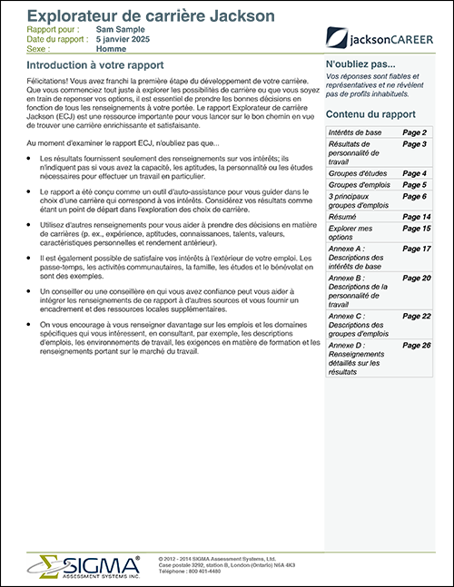L’explorateur de carrière Jackson (JCE) est une évaluation des intérêts qui guide les individus vers des carrières satisfaisantes et épanouissantes. Le rapport complet fournit une multitude d’informations personnalisées sur les carrières, y compris les caractéristiques suivantes :