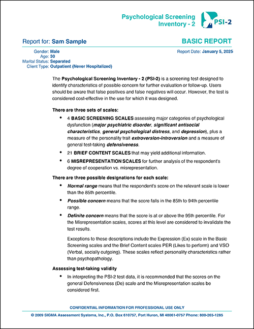 The Psychological Screening Inventory-2 (PSI-2) is a brief mental health screening device ideal for situations where professional time and resources may be at a premium. It is easy to administer and interpret and is appropriate for adolescents and adults. The PSI-2 identifies people who might benefit from more extensive examination and professional attention. Composed of 139 items, the PSI-2 can usually be completed in 15 minutes and is suitable for individual administration on SIGMA’s online testing platform. The PSI-2 can be used in community clinics, hospitals and medical facilities, high school and college counseling offices, referral agencies, courts and correctional facilities, and other mental health screening settings.